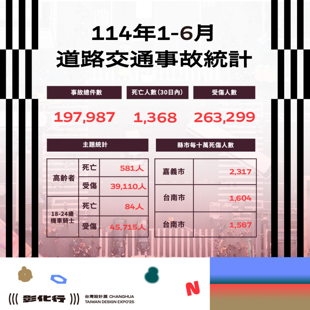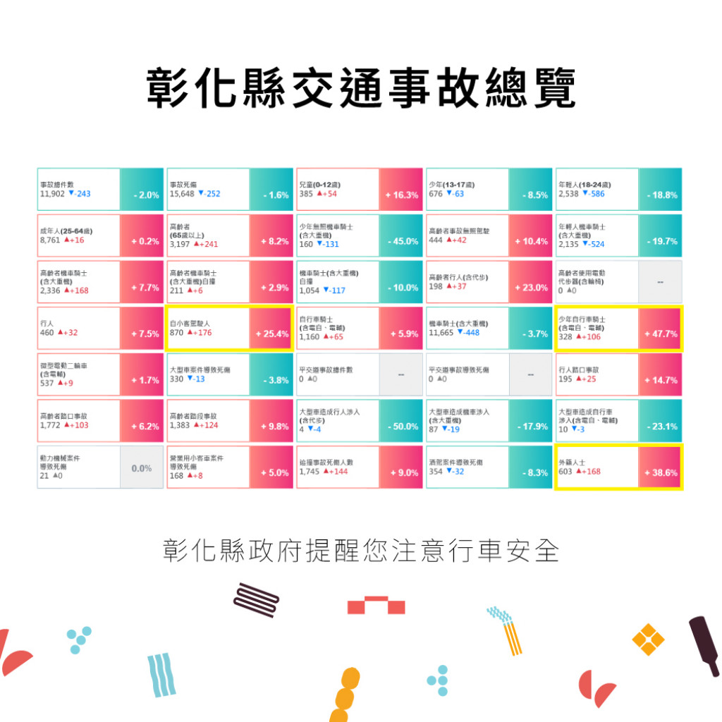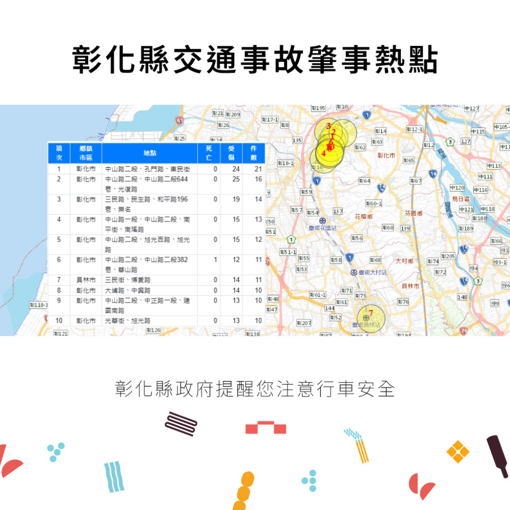 根據交通部道安資訊查詢網統計快覽數據跟112年同期比較分析,以少年自行車騎士(含電自、電輔) 事故增加47.7%最高,外籍人士事故增加38.6%次之,自小客車駕駛人增加25.4%再次之。1-6月份30日鄉鎮市每千人死傷人數於「彰化市、員林市、二林鎮」為多,肇事熱點以「彰化市」為多,合先敘明。 |