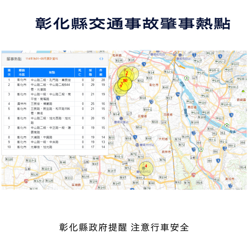 附件為「114年1-9月全國道路交通事故統計、彰化縣交通事故死傷人數增加排行、本縣各鄉鎮市30日死亡人數、肇事熱點及交通事故肇因統計」共5份統計資料宣導圖,社群宣導內容可參閱或分享本處「花現彰化-彰化縣政府新聞處」(https://pse.is/8h44cp)臉書粉絲專頁,相關宣導圖片素材請參閱:https://reurl.cc/DbyGR5。 |