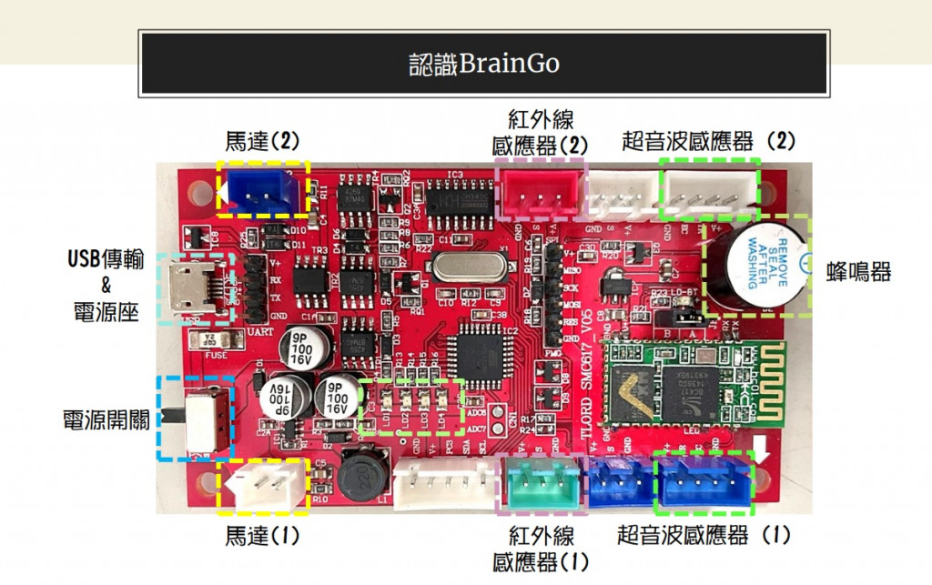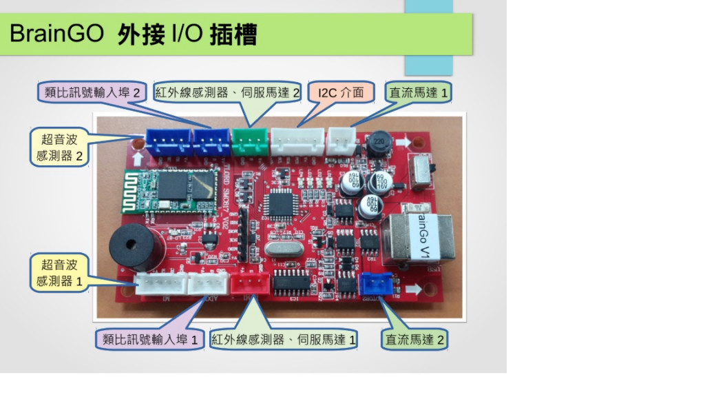 由上方後面看BrainGO智慧車 ㄧ由左至右插槽口訣