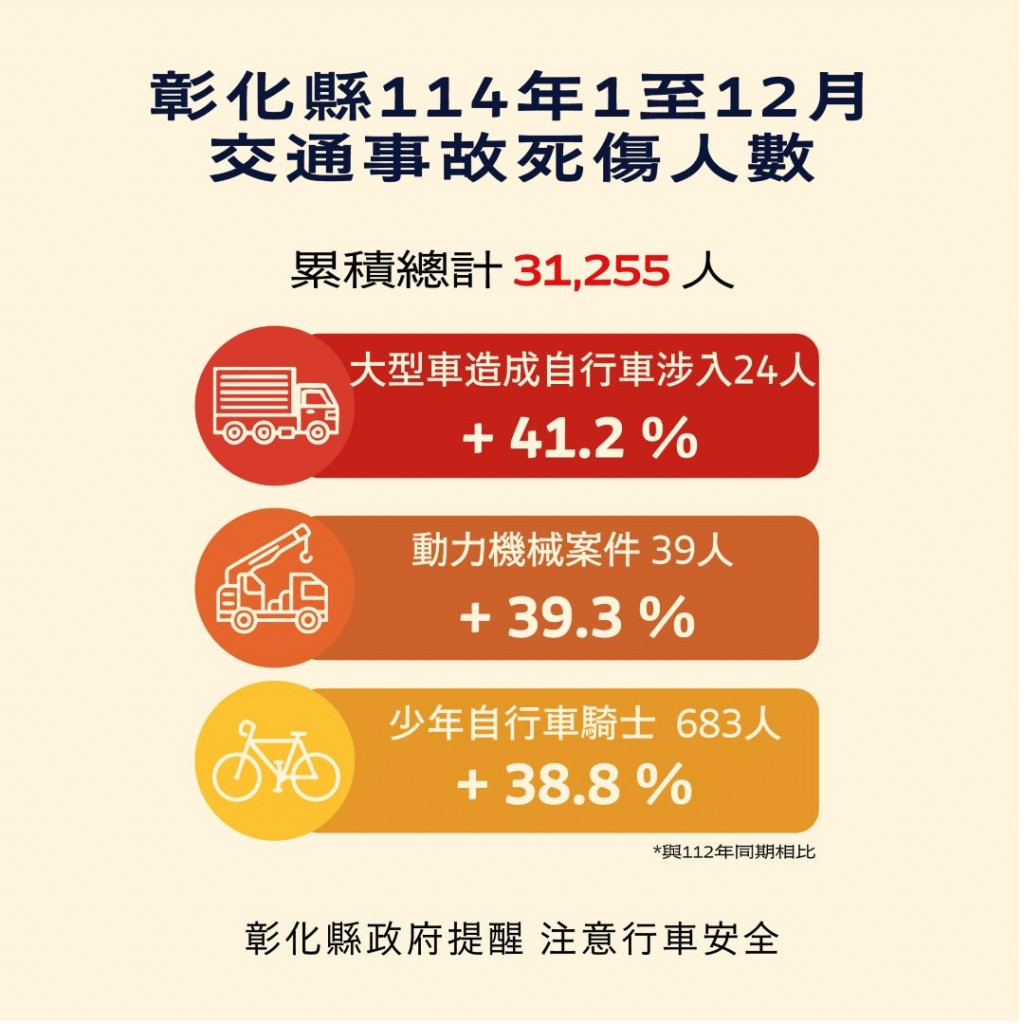 根據交通部道安資訊查詢網,本縣114年1-12月道路交通事故與112年同期比較分析,以大型車造成自行車涉入(含電自、電輔)事故增加41.2%最高, 動力機械案件 增加39.3%次之。少年自行車騎士(含電自、電輔) 增加38.8%再次之。1-12月份鄉鎮市30日死亡人數於「彰化市、員林市、鹿港鎮」為多,肇事熱點以「彰化市」為多,合先敘明。 |