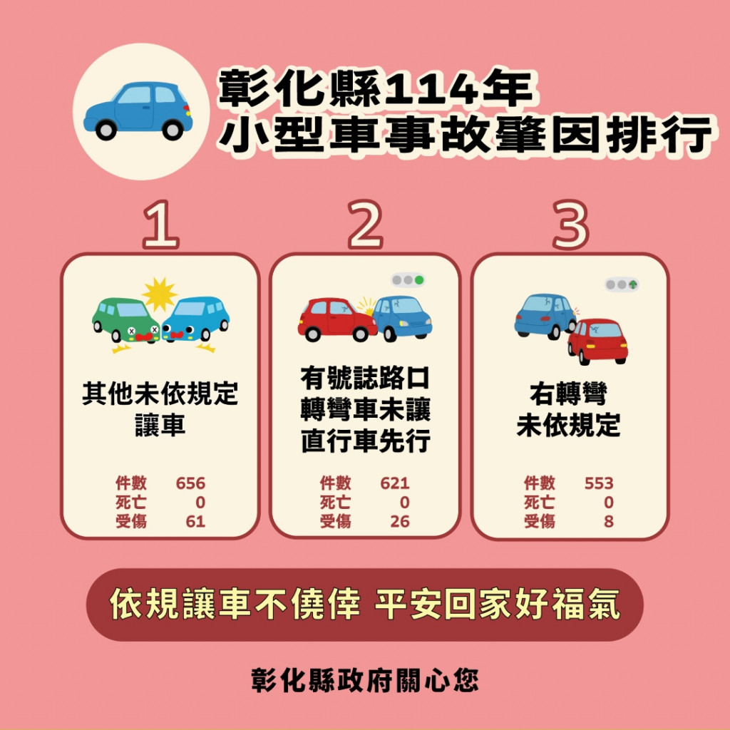 依據交通部道路安全資訊平台系統分析數據,114年彰化縣事故肇因排行: |