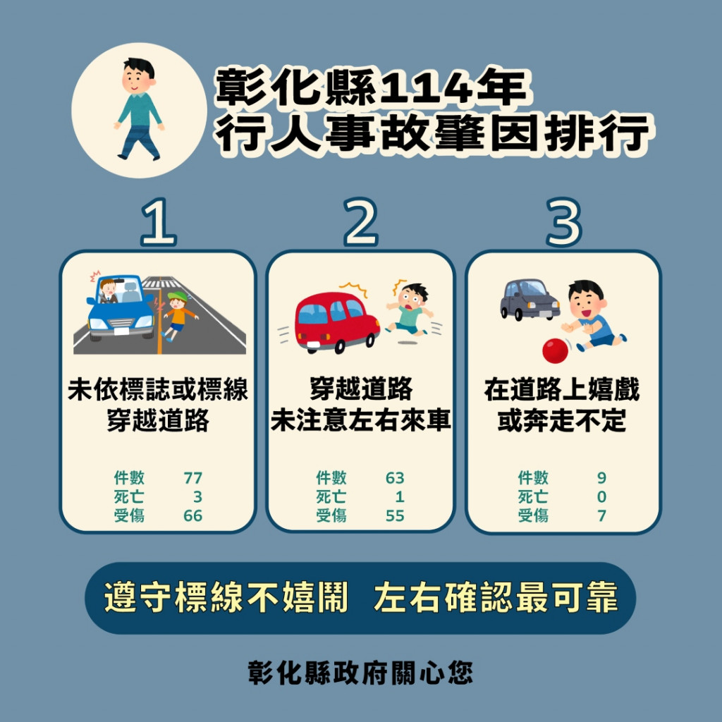 本縣114年1-12月道路交通事故死傷累計31,255人,請貴單位及所屬機關運用既有宣傳通路協助加強宣導,共同降低死傷人數,另請本縣道安宣導小組成員及本縣各鄉鎮市公所依限填復交通安全宣導辧理情形,請查照。 |