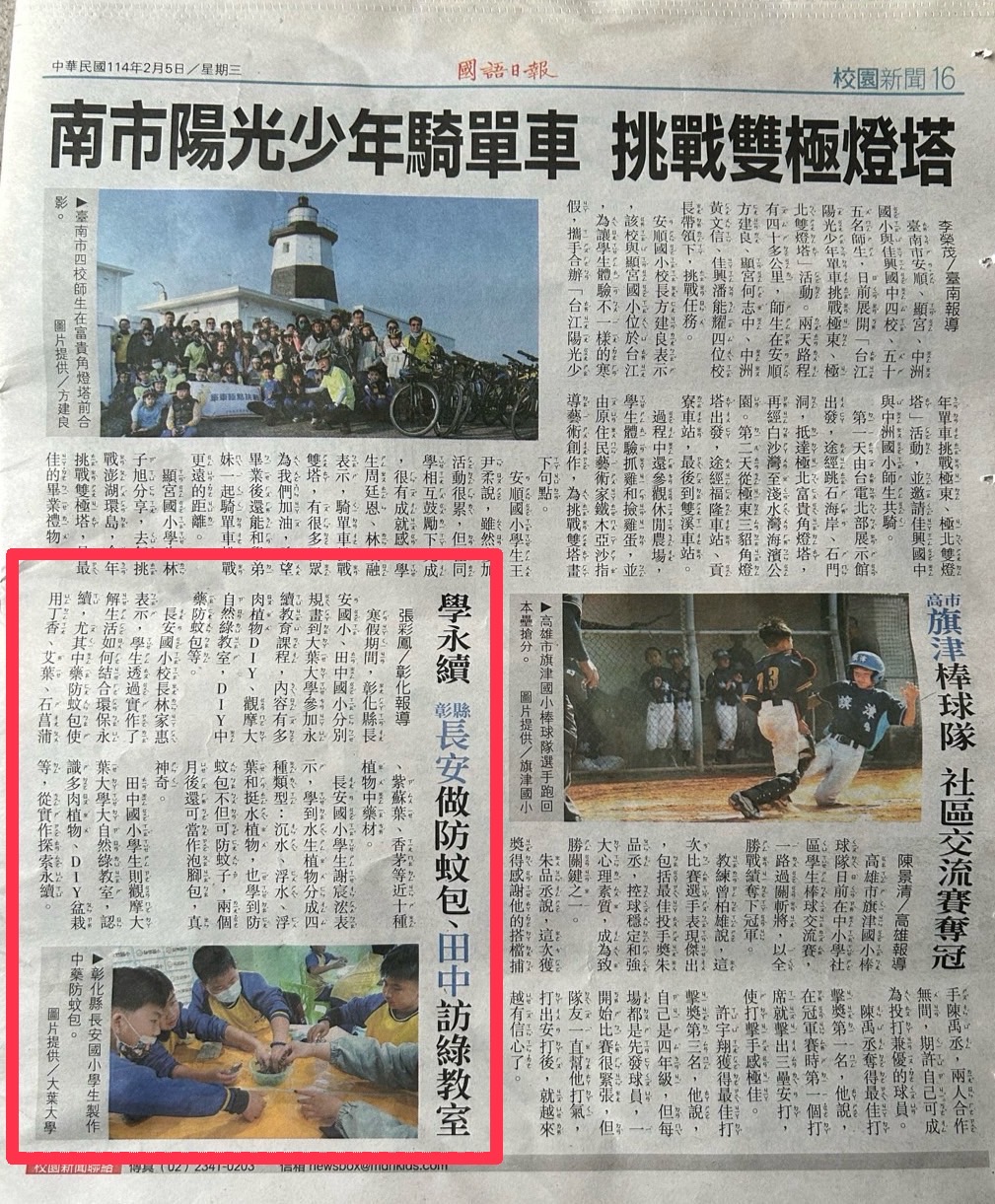 賀!本校以〈學永續,長安做防蚊包〉報導,榮獲刊登國語日報114年2月4日校園報導,全體師生同享榮耀!Good!