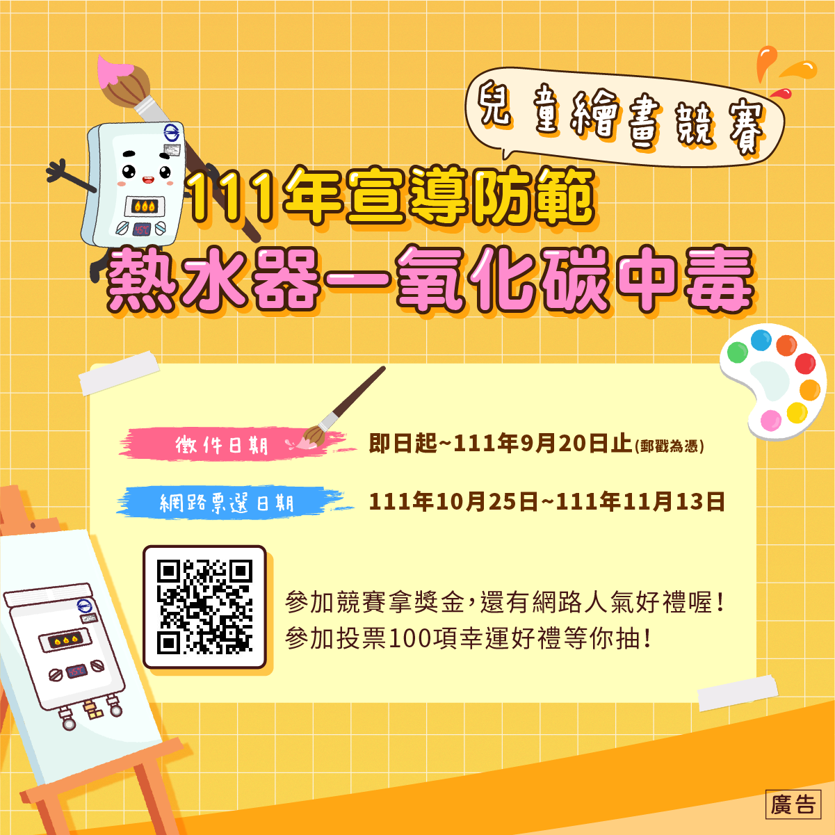 檢送內政部消防署「111年宣導防範熱水器一氧化碳中毒兒童繪畫競賽」橫幅廣告及宣傳圖卡各1份